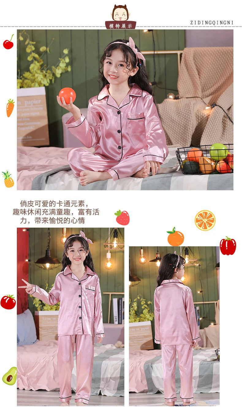 2 to 14 Years Boys Girls Pajamas Sets Kids Silk Satin Top Pant Long/Short Sleeve Solid Pyjamas Suits Nightgown Child Sleepwear